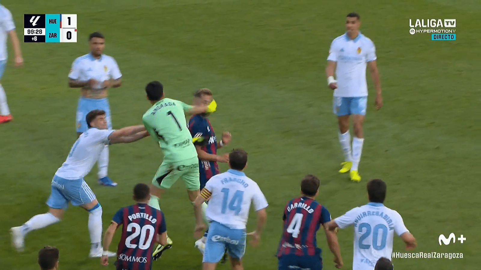 Seguranças e reservas deixaram o banco para separar os envolvidos, mas o empurra-empurra durou quase três minutos. Quando a situação se acalmou, o árbitro revisou a confusão e puniu mais dois jogadores: Dani Tasende, pelo Zaragoza, e Dani Jiménez, goleiro reserva do Huesca.