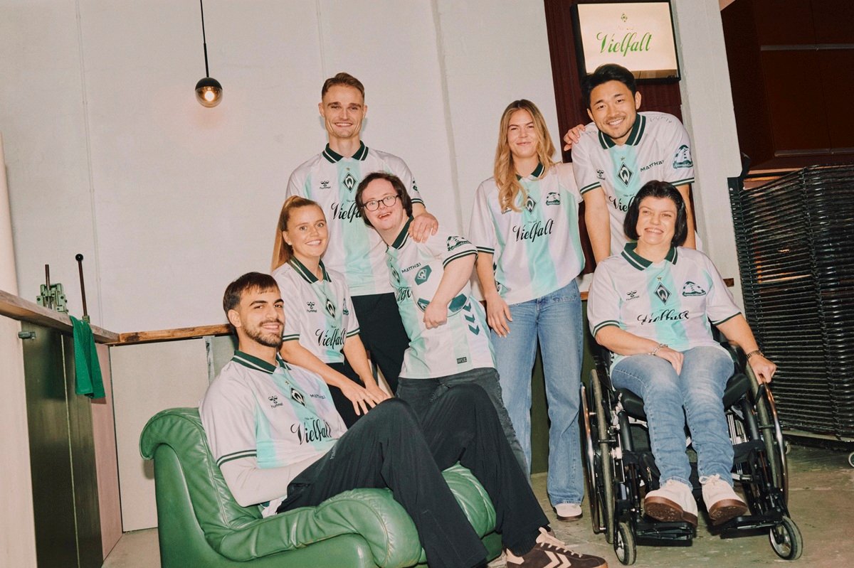 Nos ombros, a novidade que conecta moda e acessibilidade: a palavra “WERDER” aparece em braille à esquerda, enquanto “VIELFALT” (diversidade, em alemão) ocupa o lado direito. O recurso tátil permite que a mensagem seja percebida também por torcedores cegos ou com baixa visão.