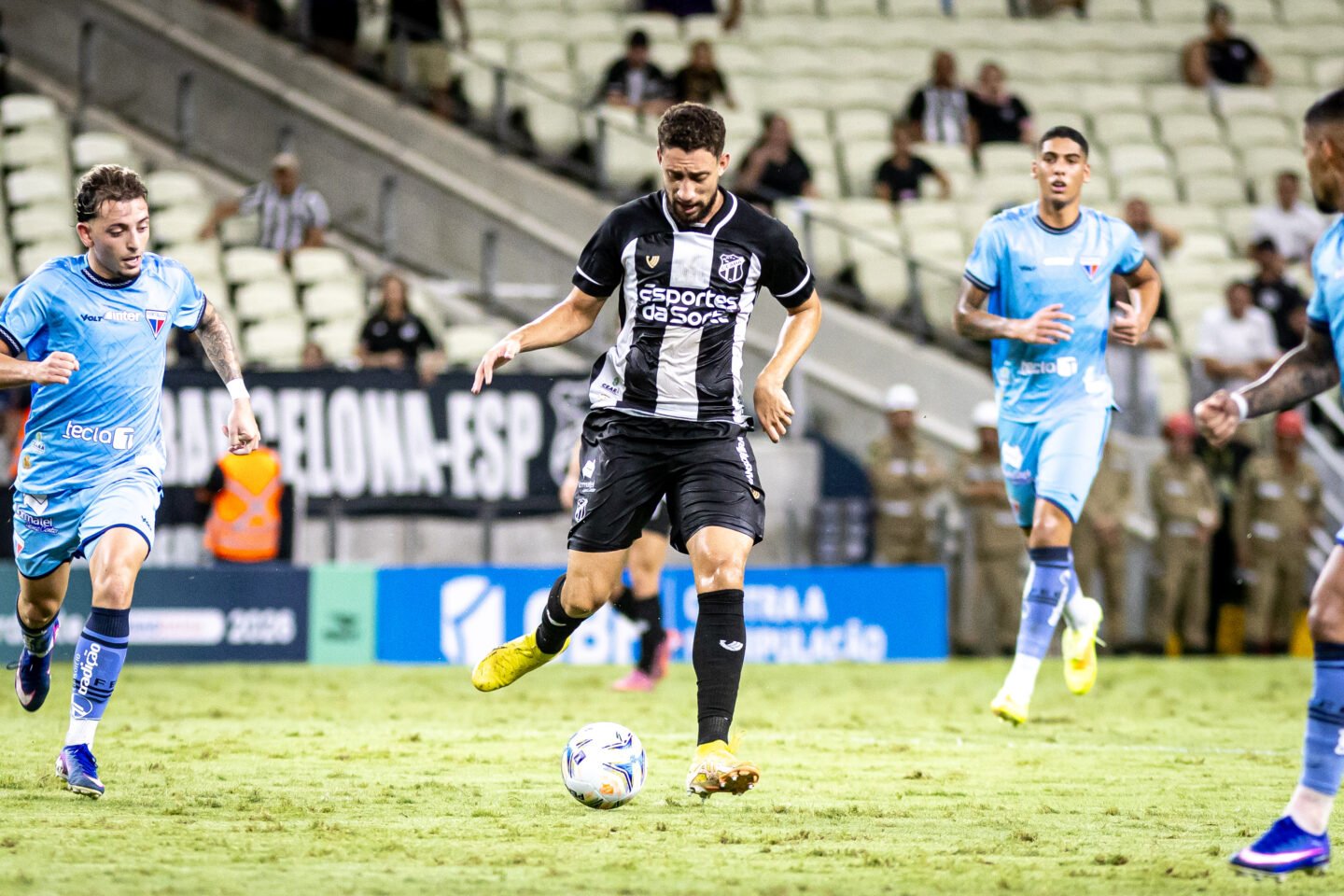 O jogo começou elétrico. Aos 7 minutos, Lucas Emanoel balançou a rede, mas teve o gol anulado por impedimento de Paulo Baya. O Ceará respondeu com Fernandinho, que obrigou Brenno a salvar o Fortaleza em chute de fora da área. A tensão explodiu aos 22’, quando Ryan brecou um contra-ataque e iniciou a confusão que renderia sete cartões, incluindo o vermelho direto para Fernandinho.